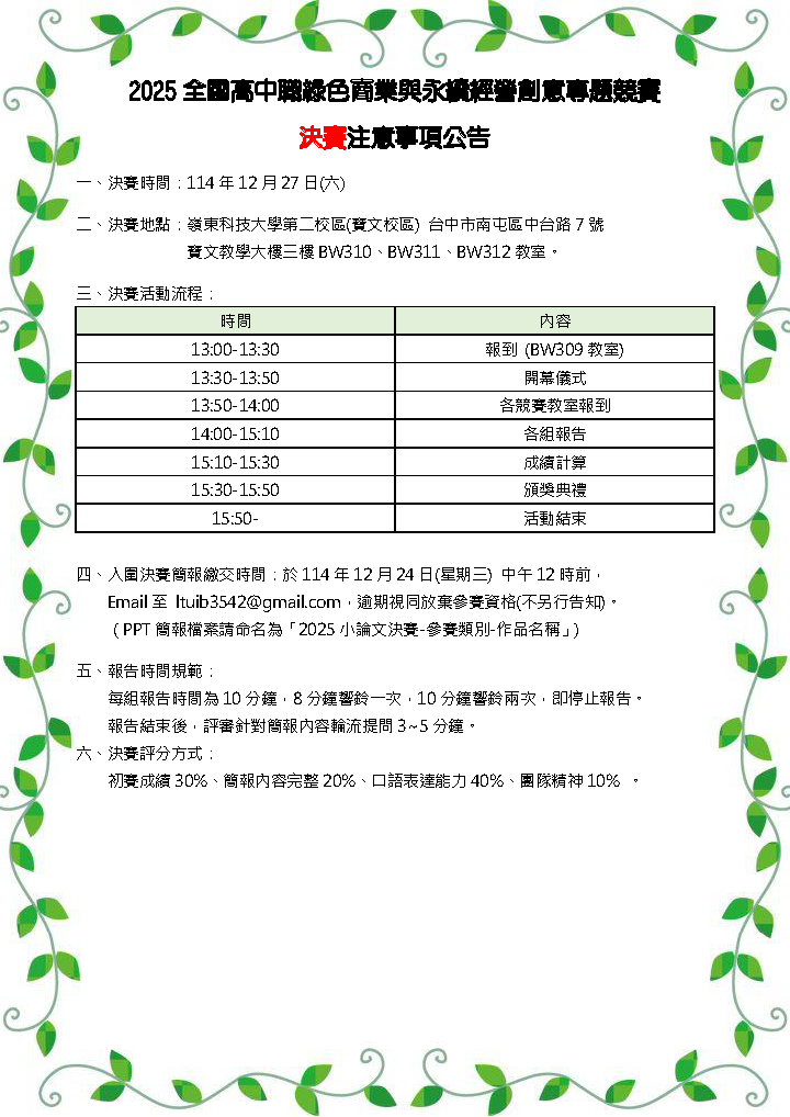 【決賽注意事項 】2025 全國高中職綠色商業與永續經營創意專題競賽